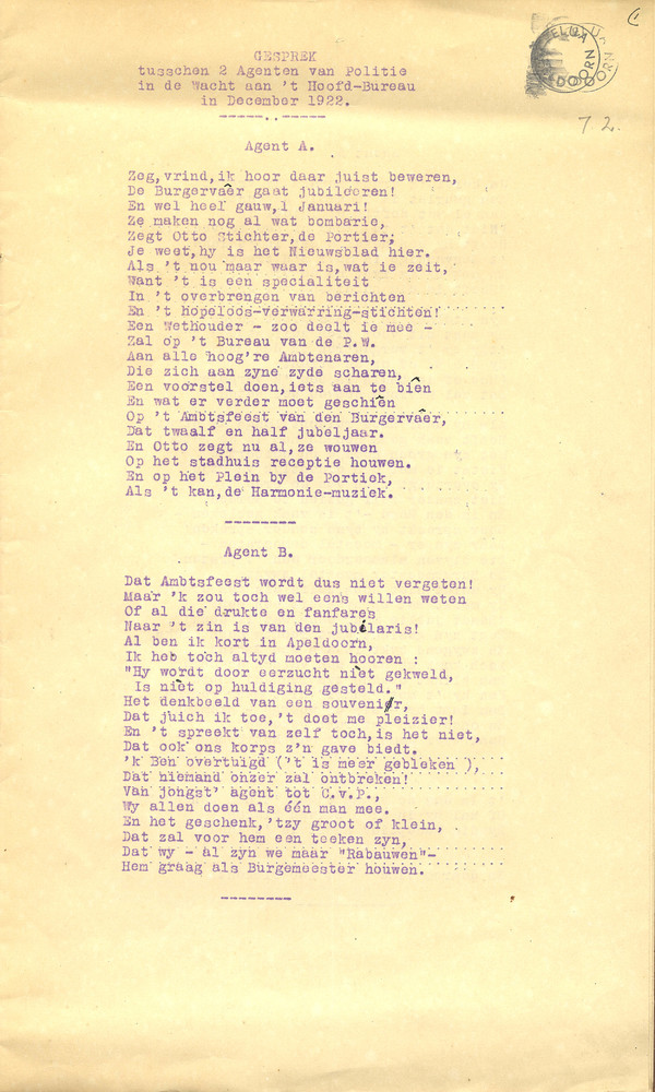 Gesprek tusschen 2 agenten van politie in de wacht a...
