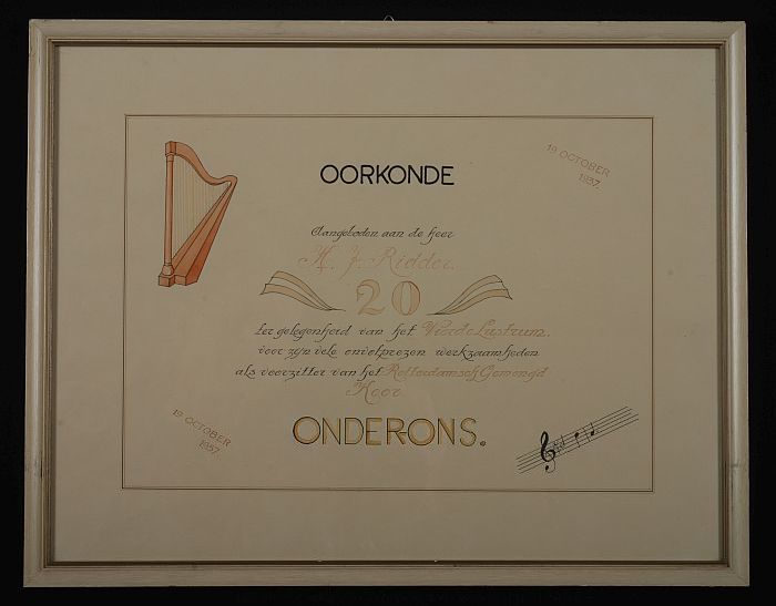 Ingelijste oorkonde voor de heer H.J. Ridder, aangeb...