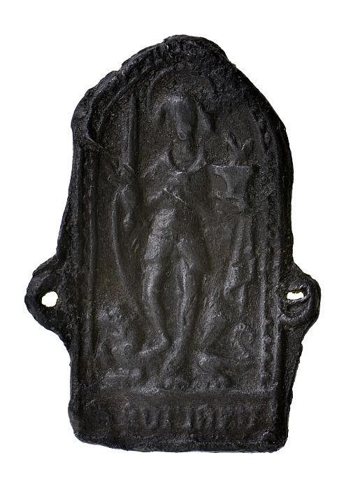Pelgrimsinsigne met staande man met zwaard, eronder ...