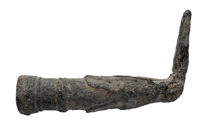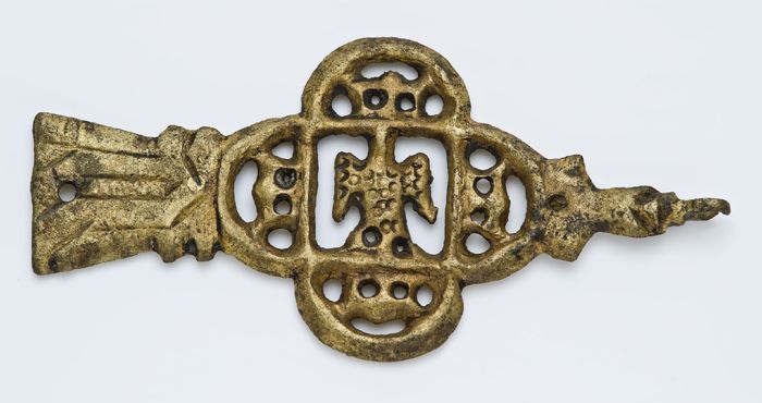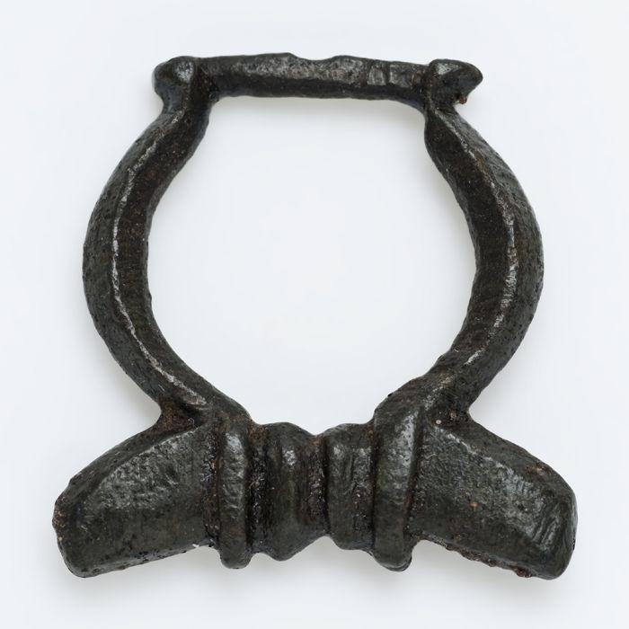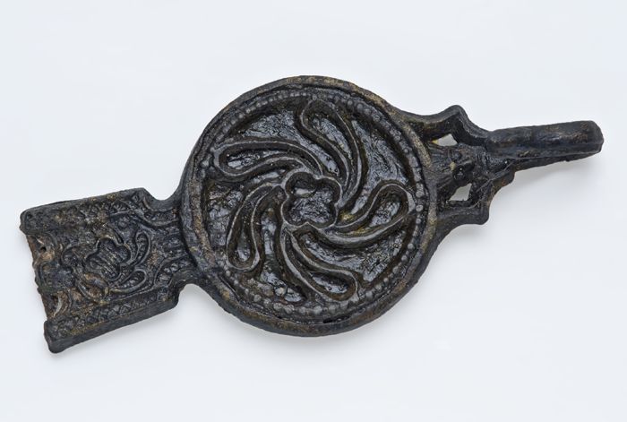 Tinnen riemtong, riemhaak met getordeerd bladmotief ...