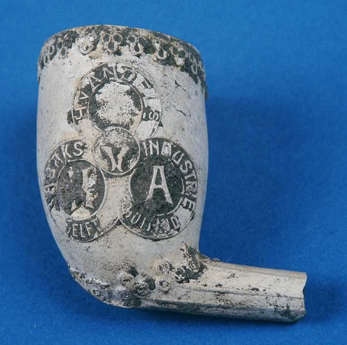 Kleipijp zonder hiel, in reliëf versierd met logo va...