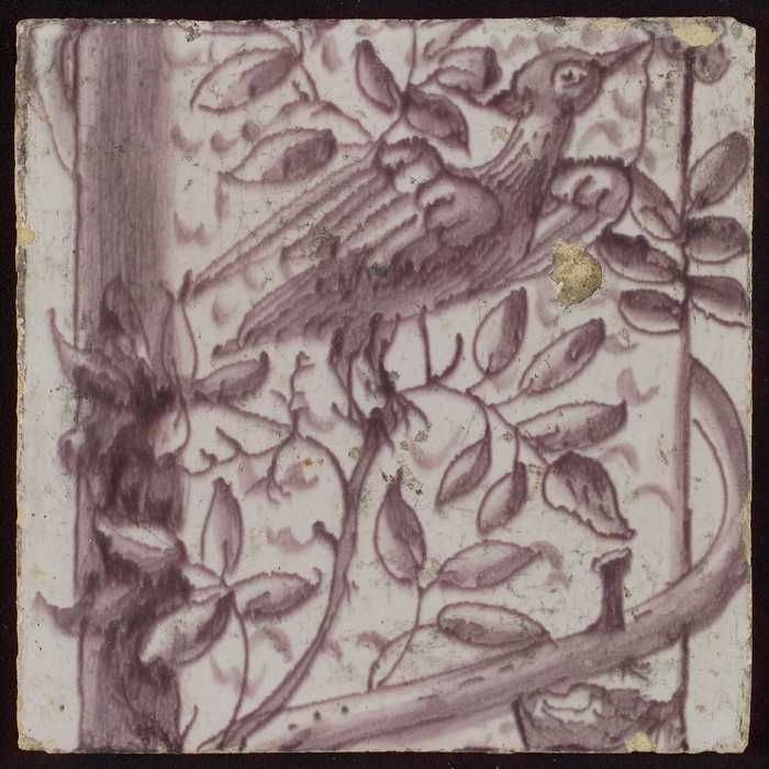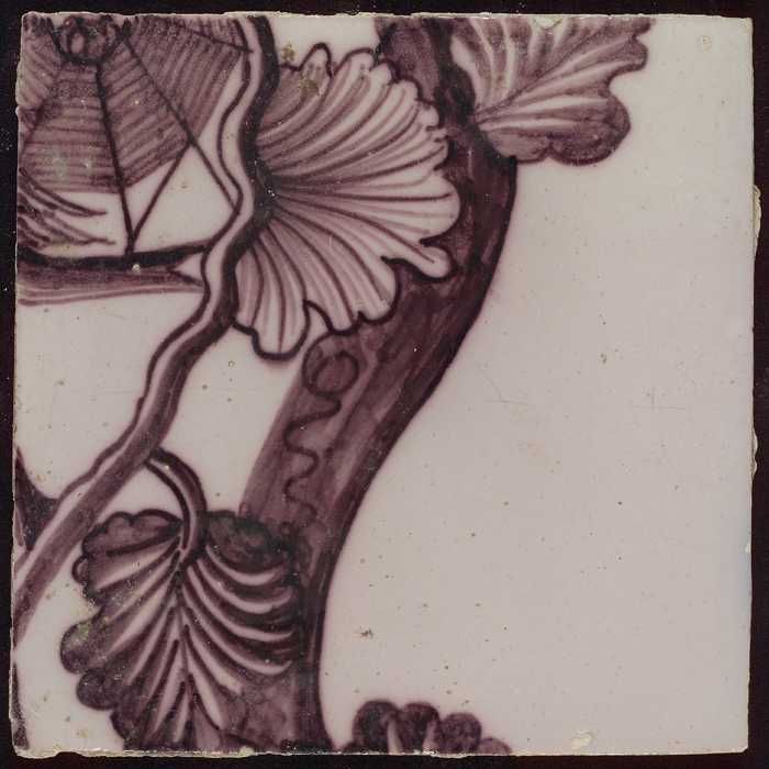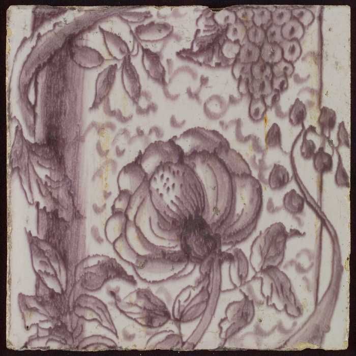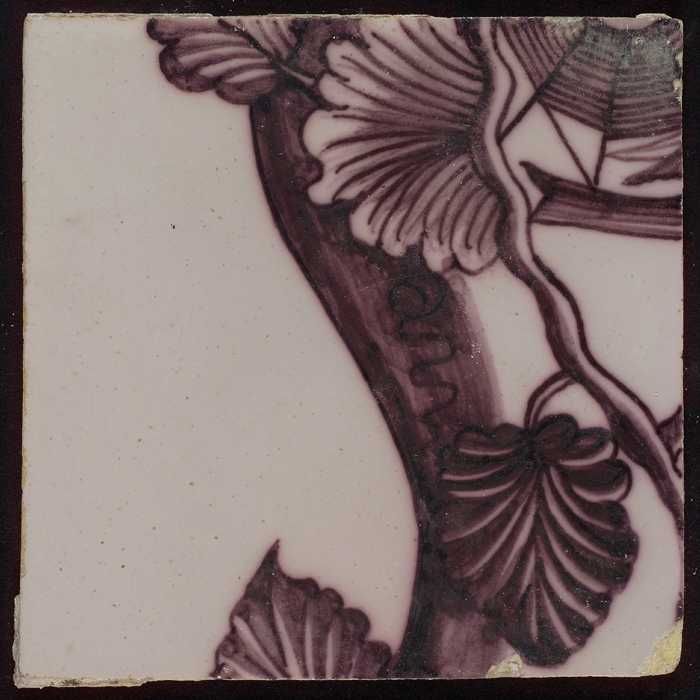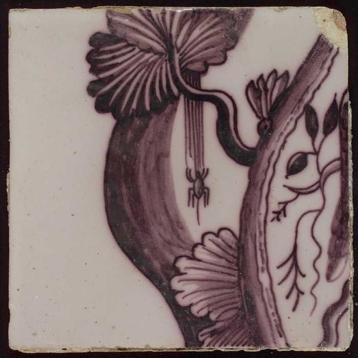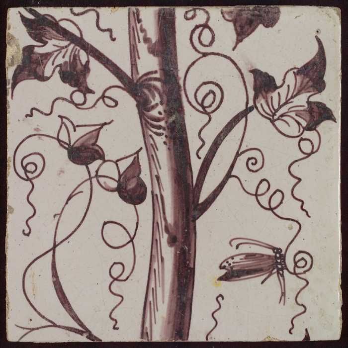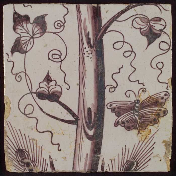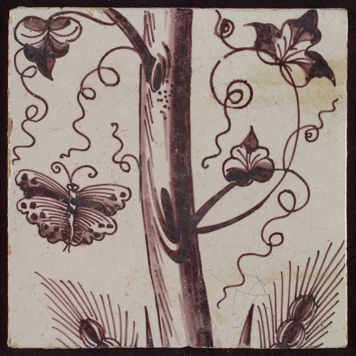 Tegel van paars pilaster met boomstam waaraan gekrul...