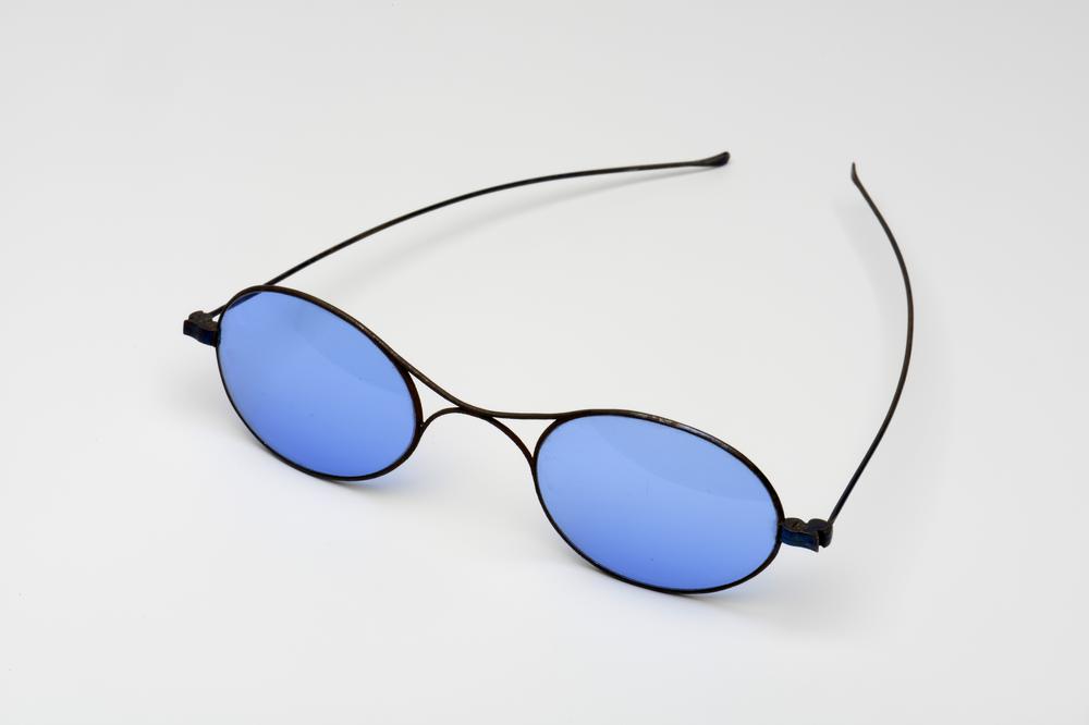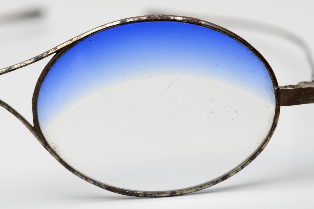 slapenbril met stalen montuur en blauw getinte glazen