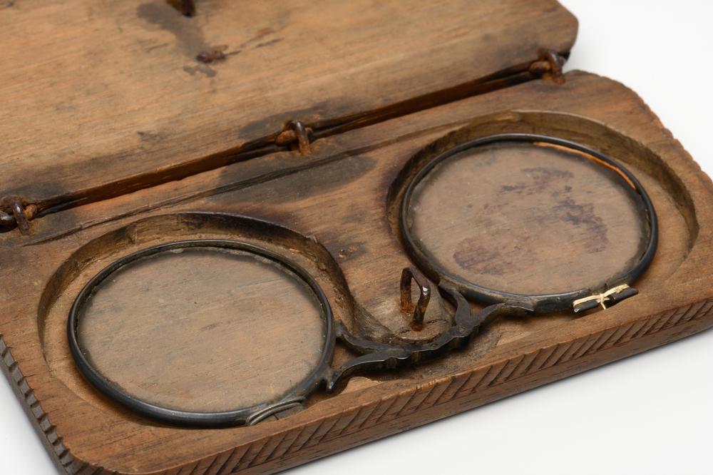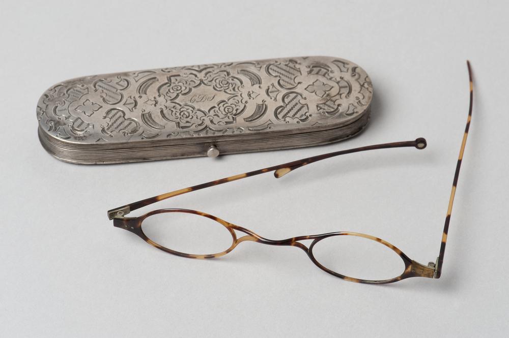 Geklonken bril in leren etui