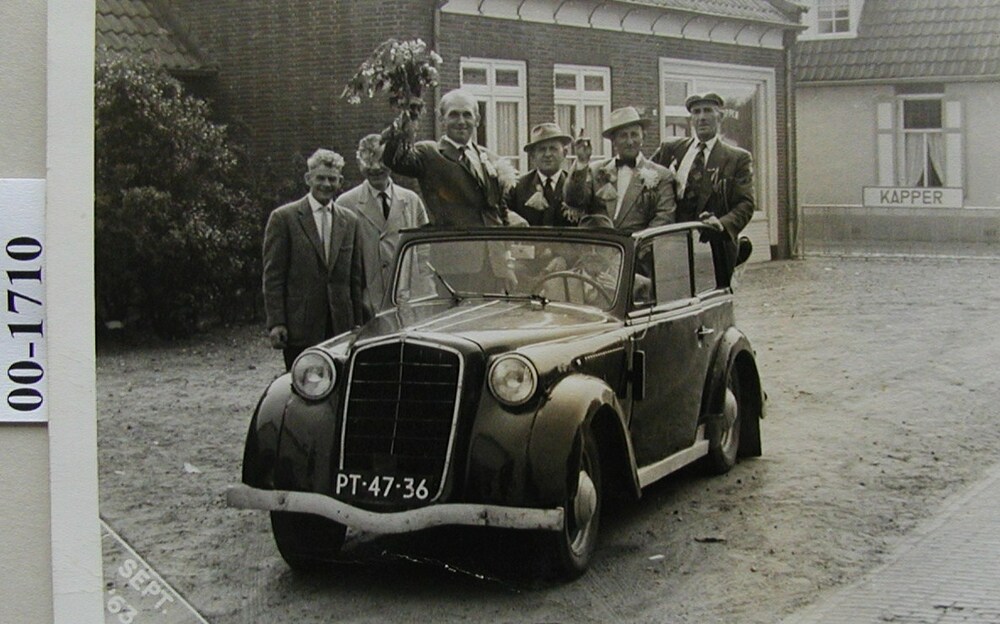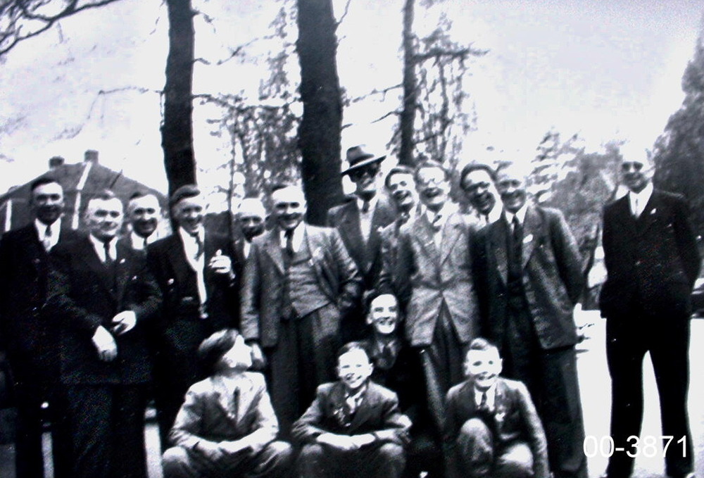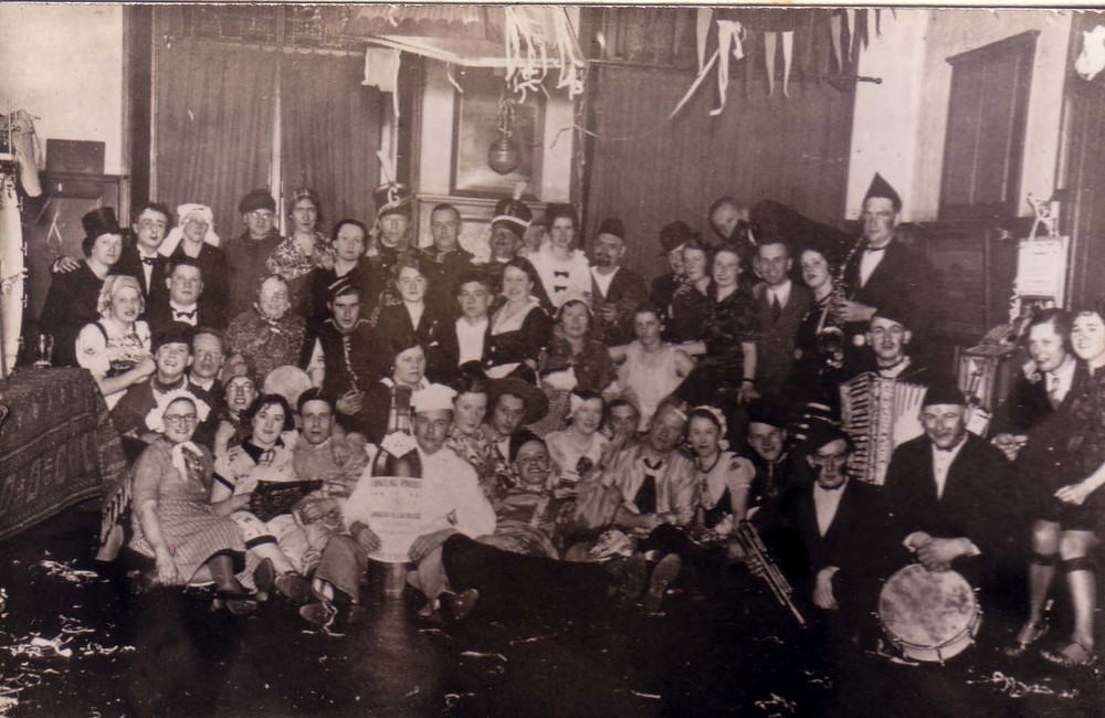 Groepsfoto van kermisgangers voor de kapsalon van Sj...