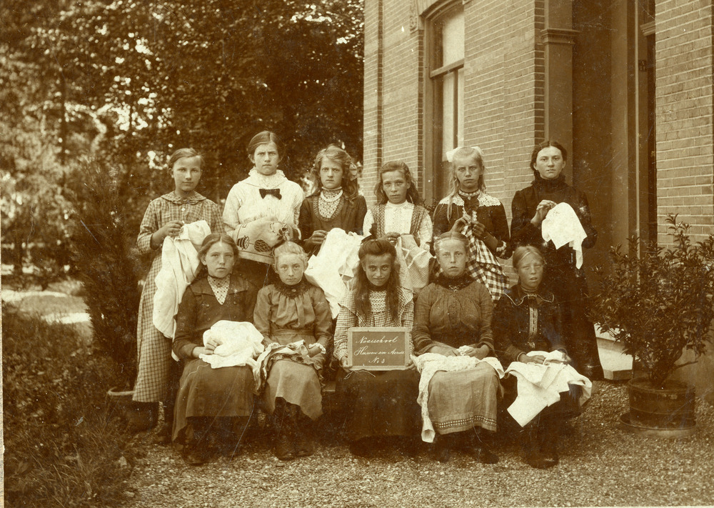 Zwart-wit foto van de leerlingen van naaischool numm...