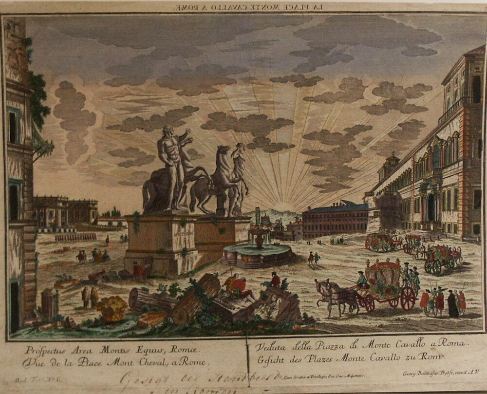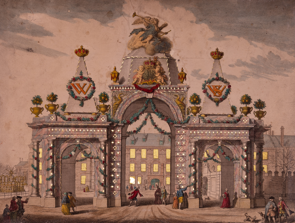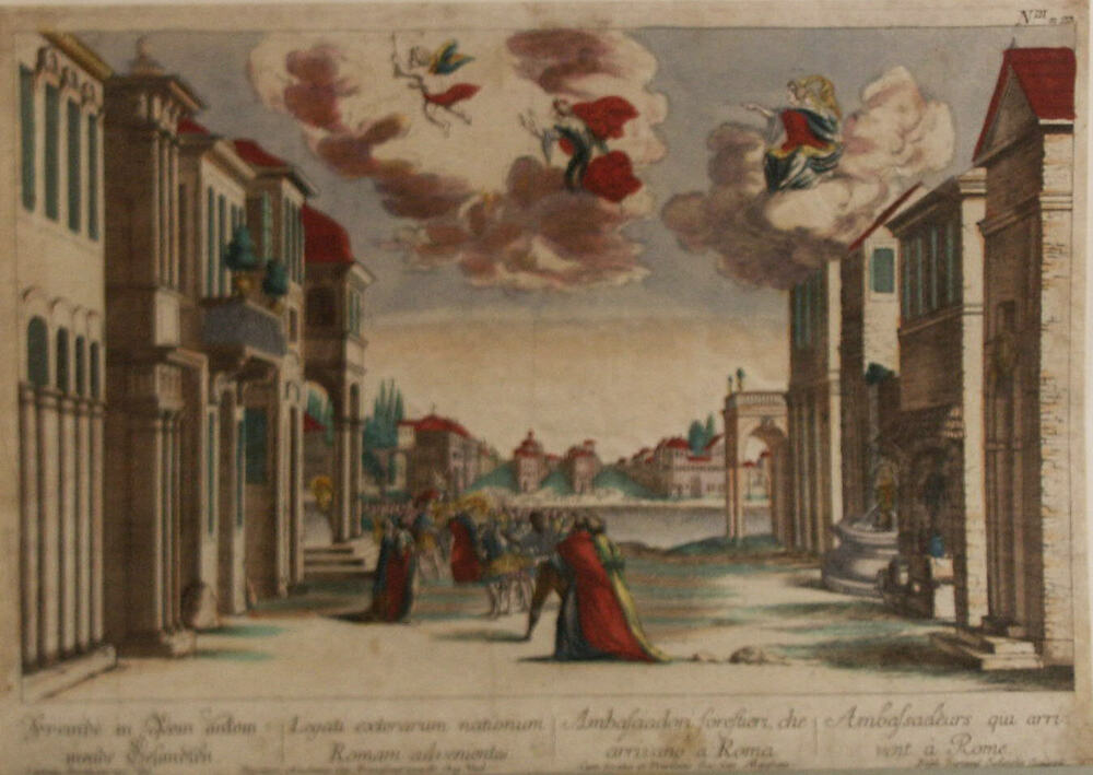 Kunstplaat Het Rekest. Trap met troon en groot aanta...