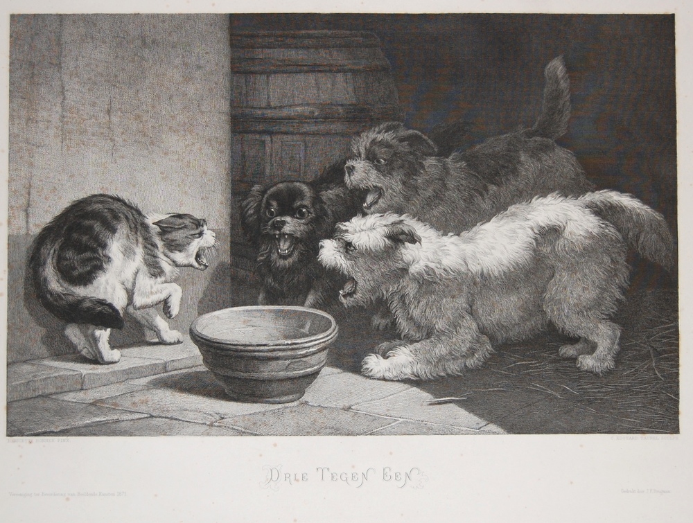 Kunstplaat "Drie tegen een". Drie blaffende honden e...