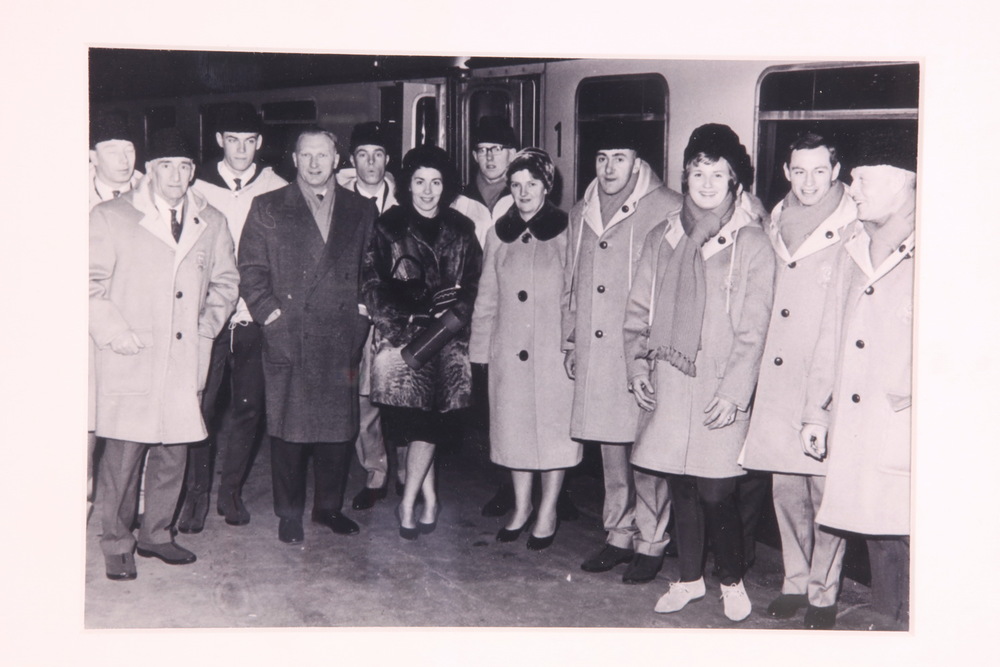 Zwart-witfoto van de gehele schaatsploeg van de Olym...