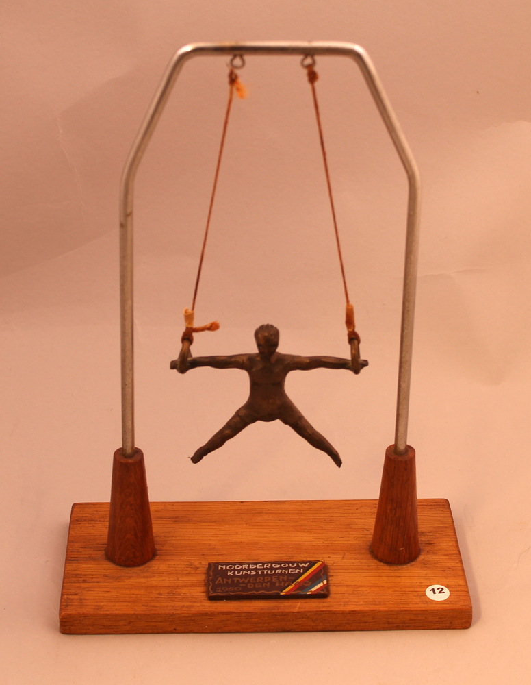 Beeldje van een turner in de ringen is gemaakt t.g.v...