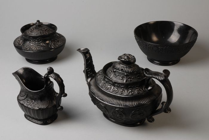 Vierdelig zwart Wedgwood rouwservies: theepot met re...