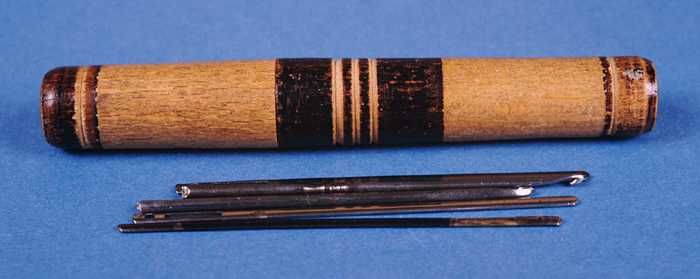 Cilindervormige haaknaaldenkoker van gelakt hout