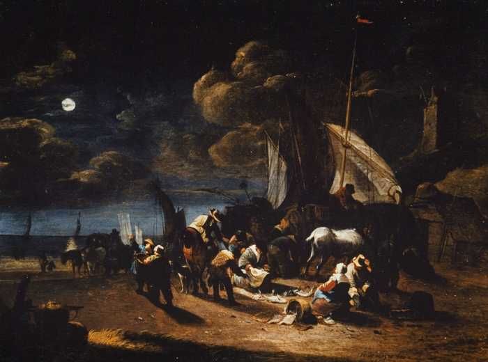 Vissers op het strand bij nacht