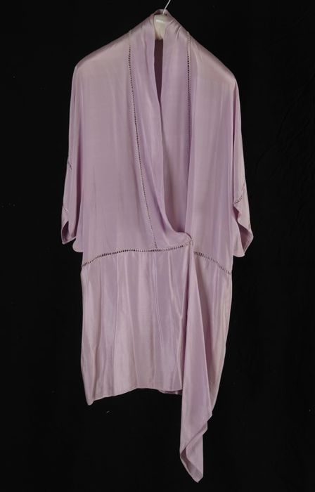 Lila zijden ochtendjas met raglanmouwen en ajour-werk