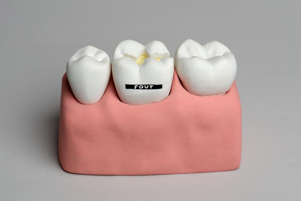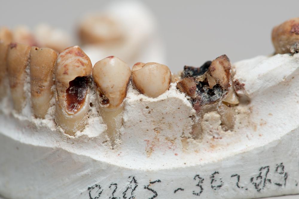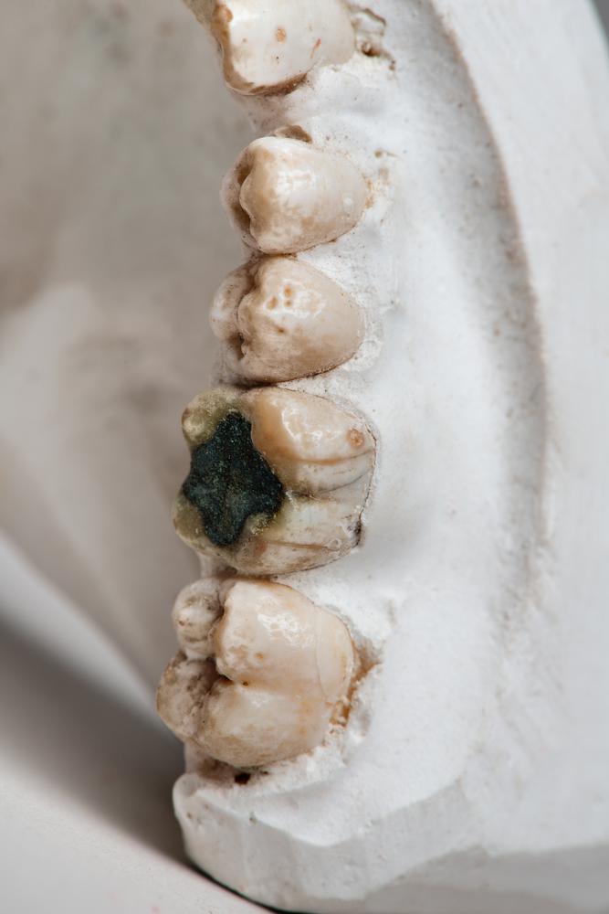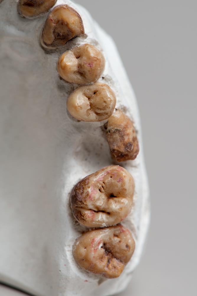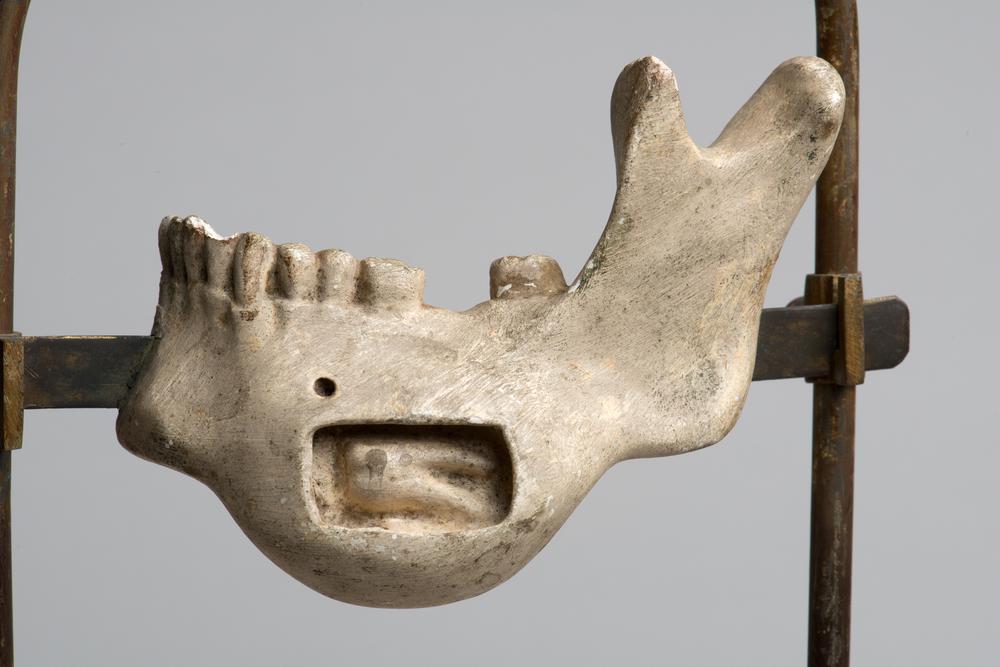Gipsmodel van een onderkaak met getrokken tanden en ...