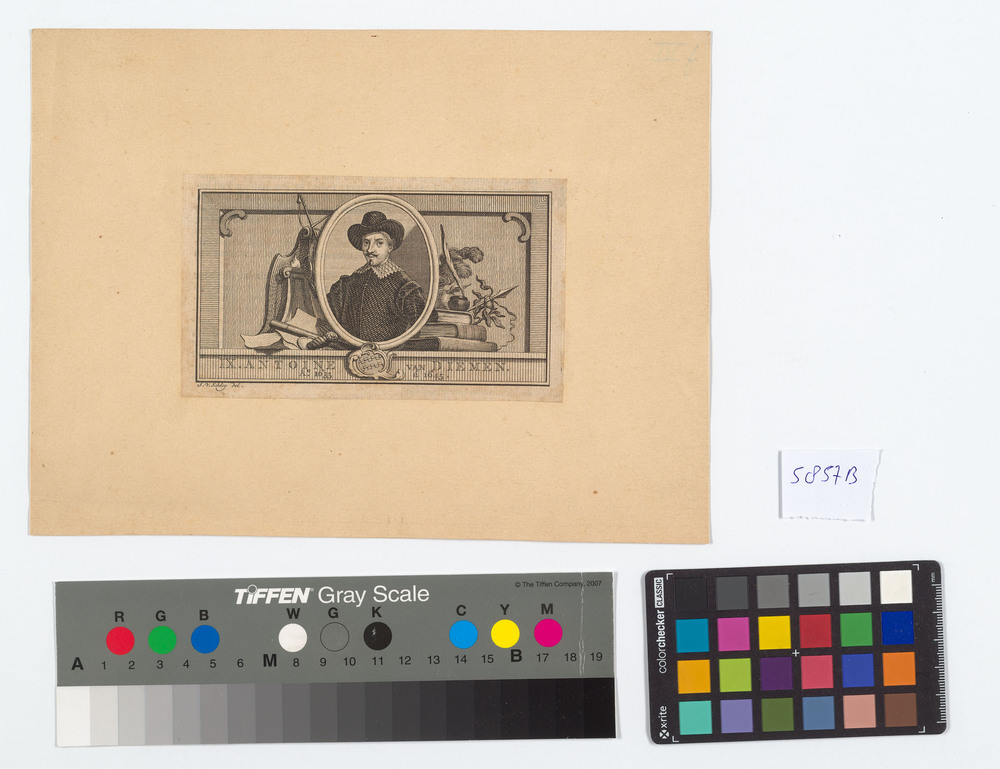portret binnen een ovaal borststuk van Hugo de Groot...