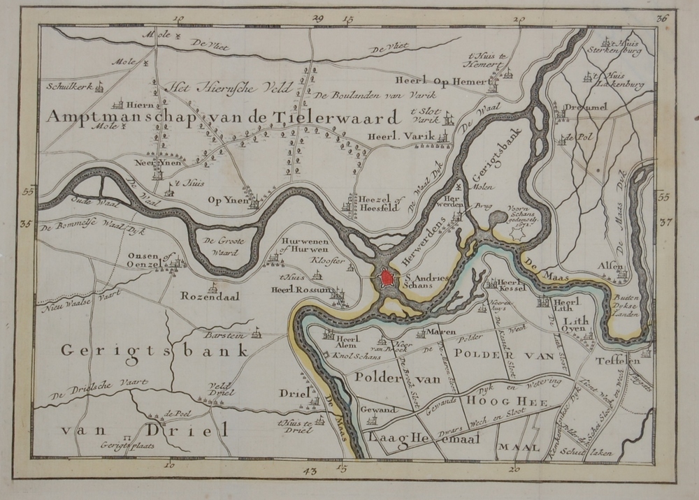 kaart van Tielerwaard en Bommelerwaard met de rivier...