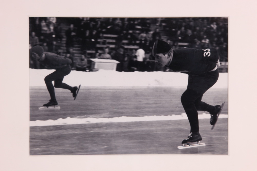 Zwart-witfoto van twee lange baan schaatsers
