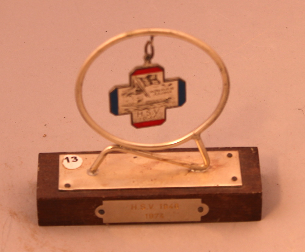 Standaard met daar rood-brons kleurige medaille voor...