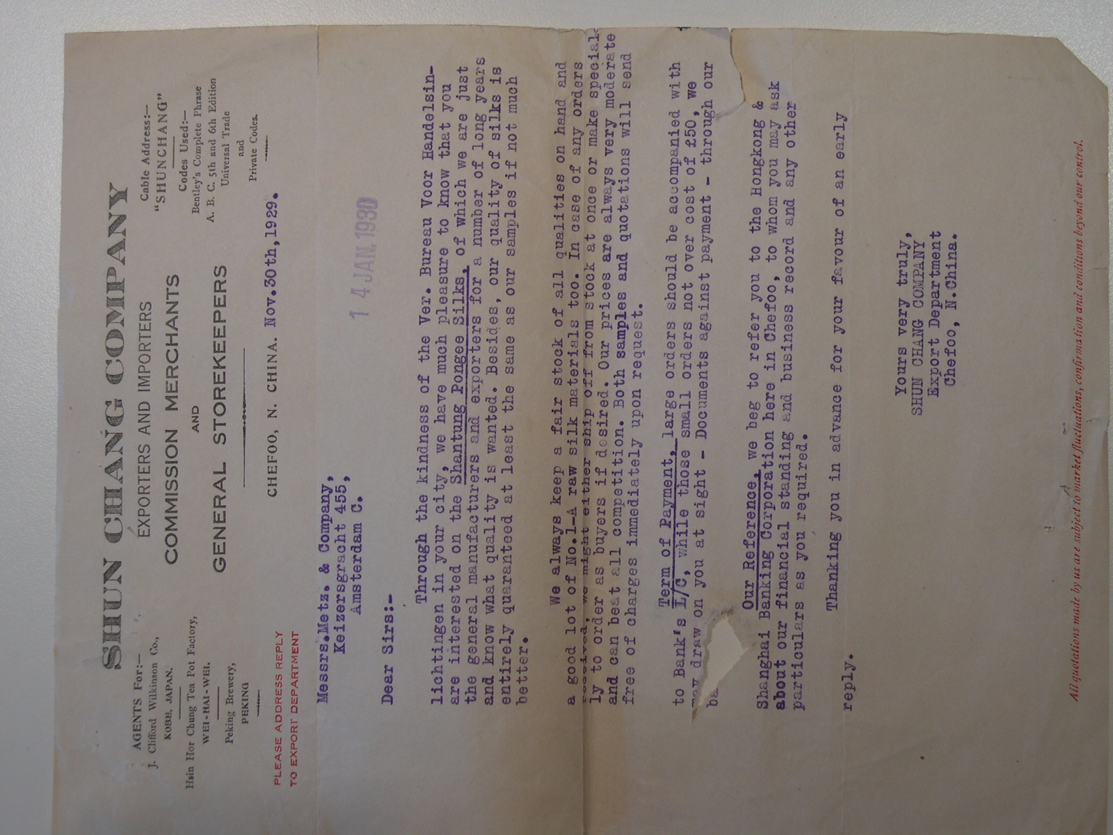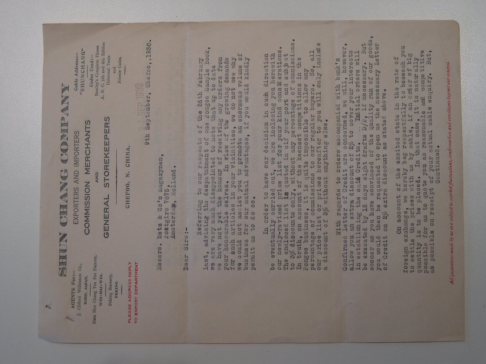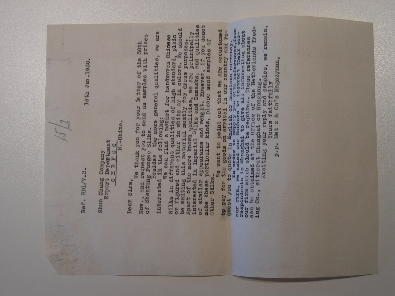 Briefwisseling Shun Chang Company met Metz & Co Maga...