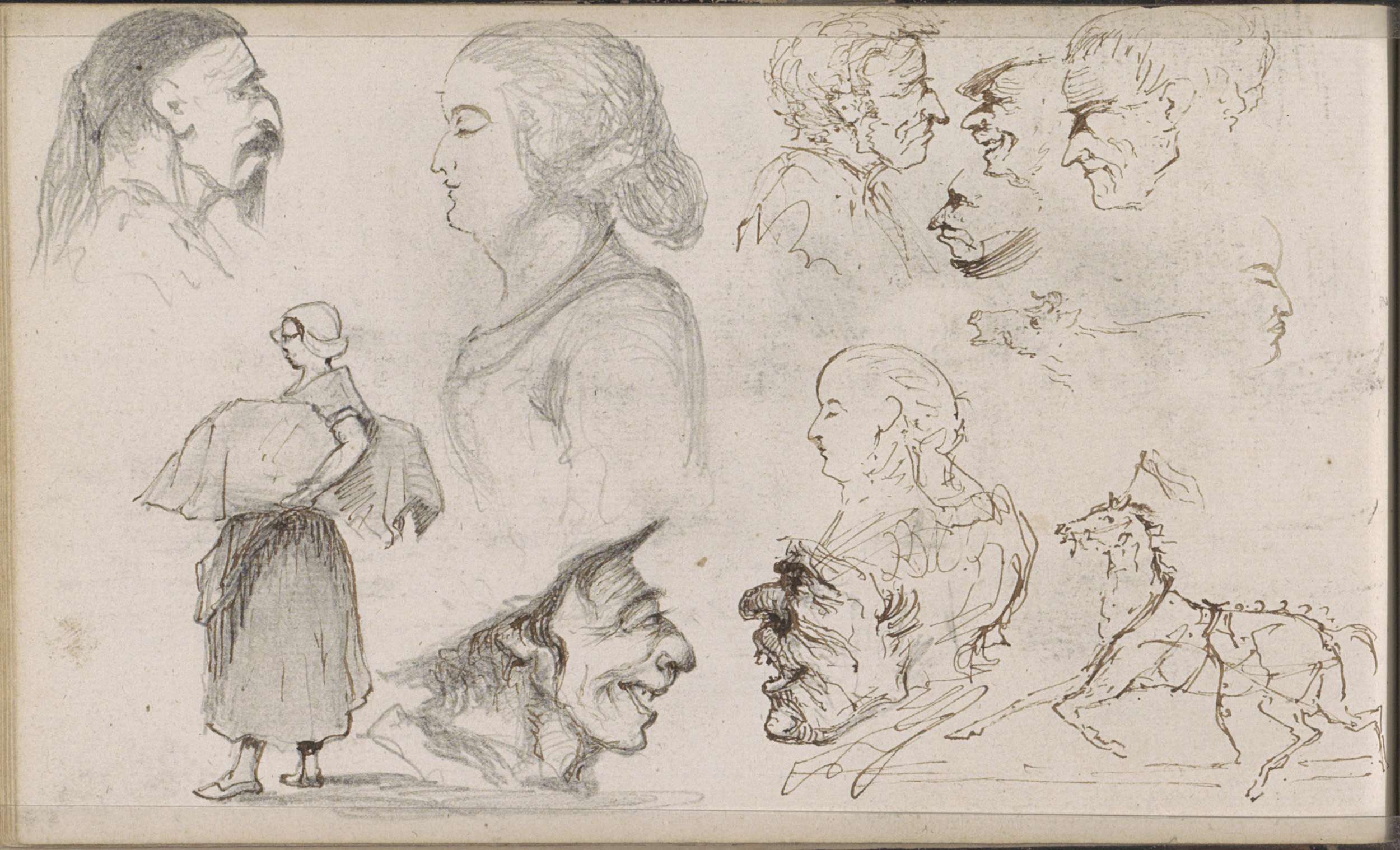 Galopperend paard, mannen- en vrouwenkoppen en een b...