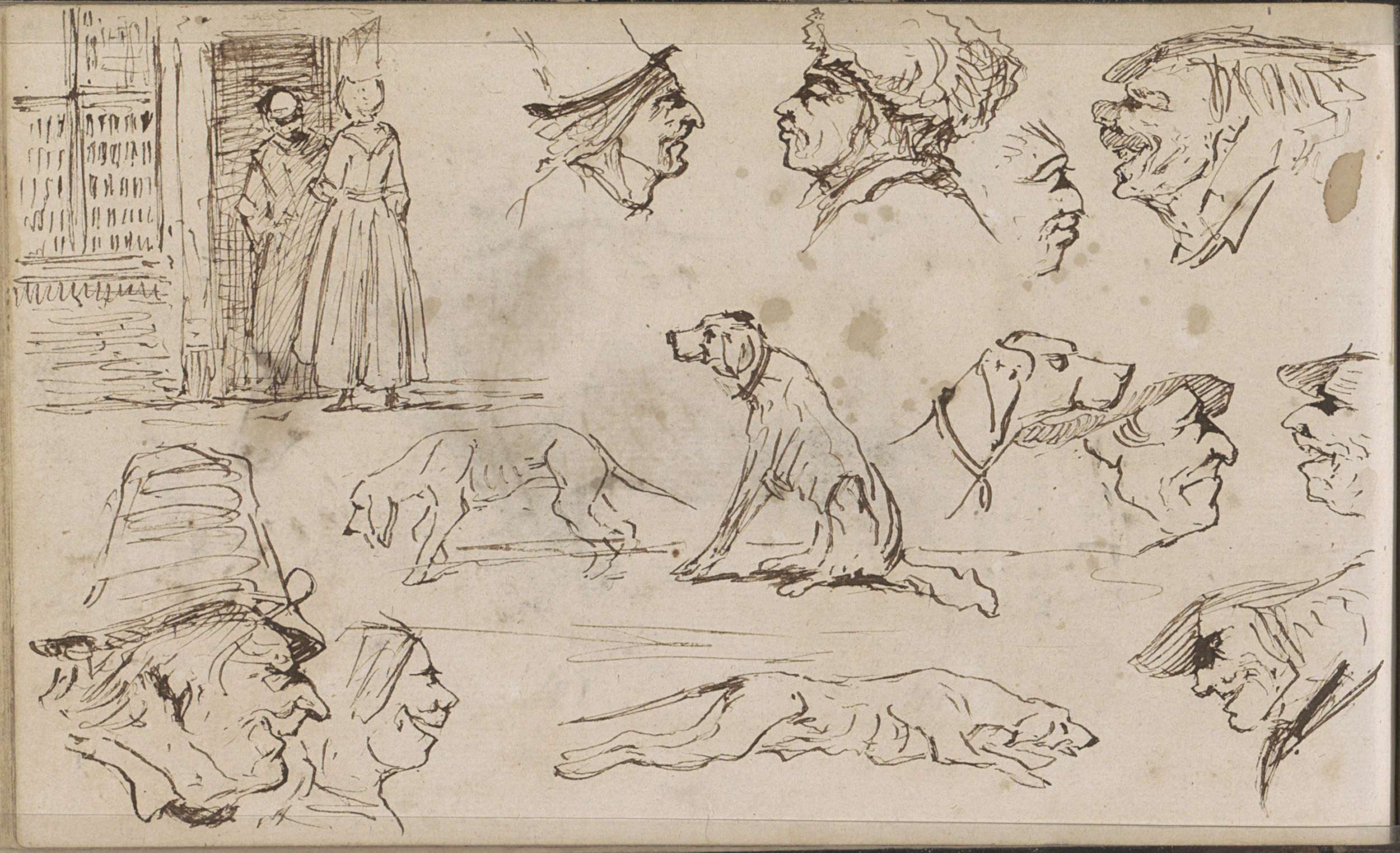 Paard, een hond en mannen- en vrouwenkoppen