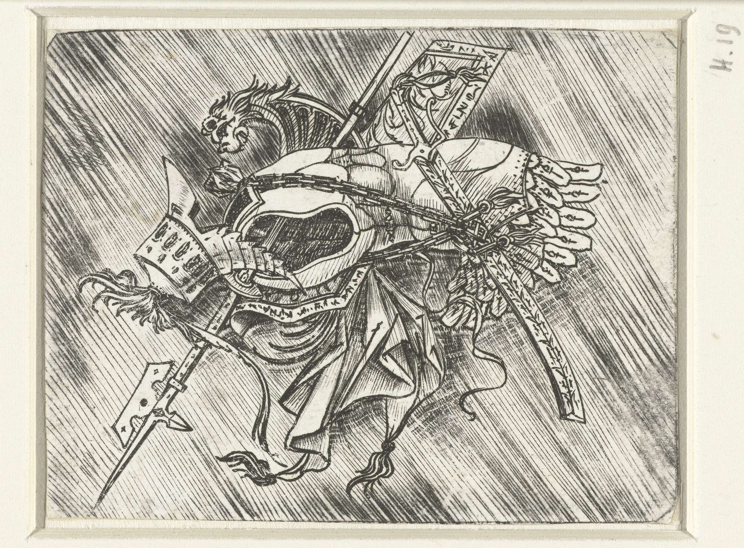 Wapentrofeeën waaronder harnas en helm en hellebaard