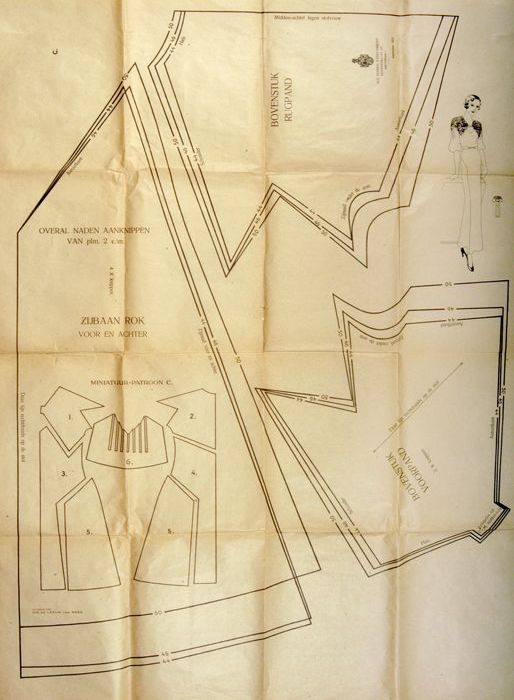 Twee patronenbladen voor lange damesjapon met halfla...