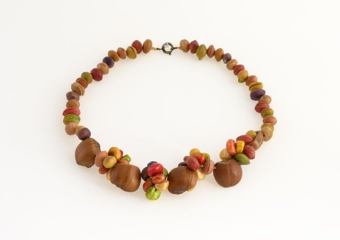 Halsketting van aaneengeregen gekleurde kersenpitten...
