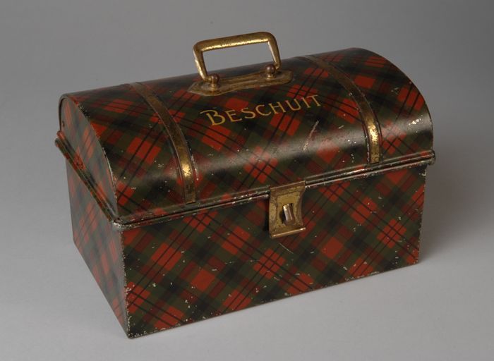 Rood-groene trommel met "BESCHUIT"