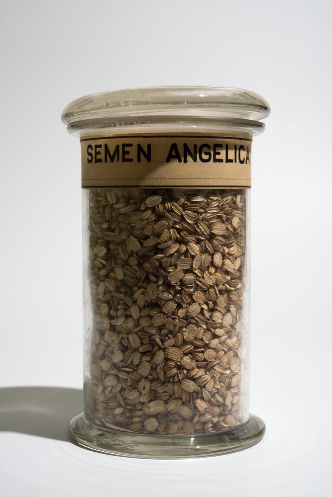 Droogpreparaat van witte zaden van de grote engelwortel