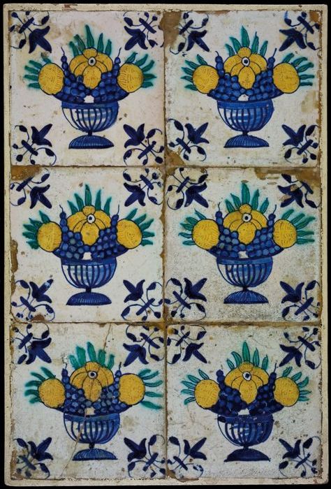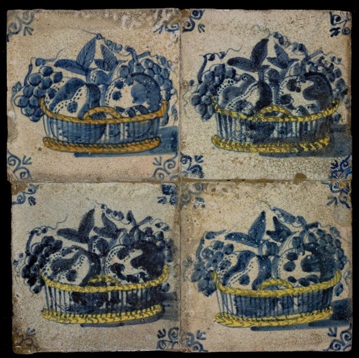 Tegelveld, vier tegels, vruchtendecor, in blauw en g...