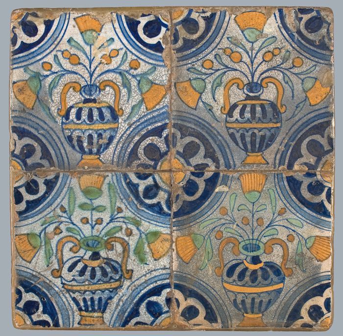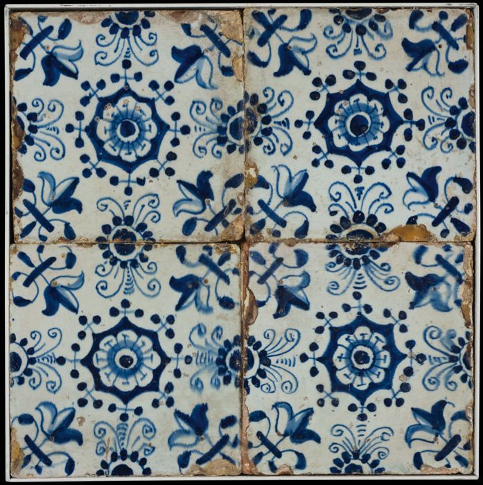 Tegelveld, blauw op wit, vier ornamenttegels, centra...