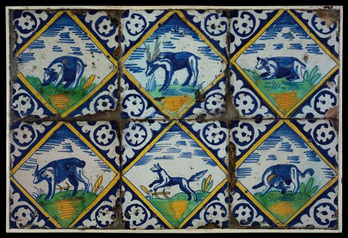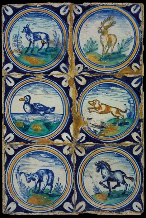 Tegelveld, zes tegels in kwadraat, hert en twee hond...
