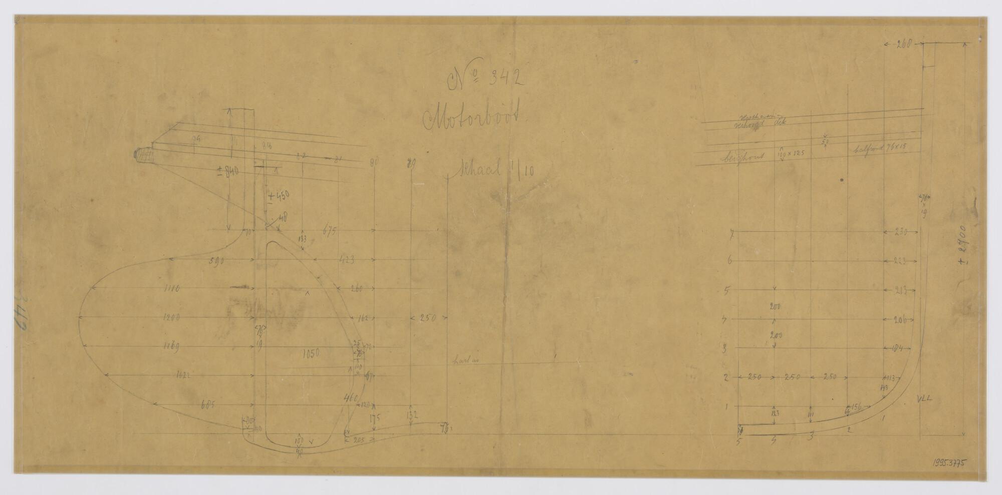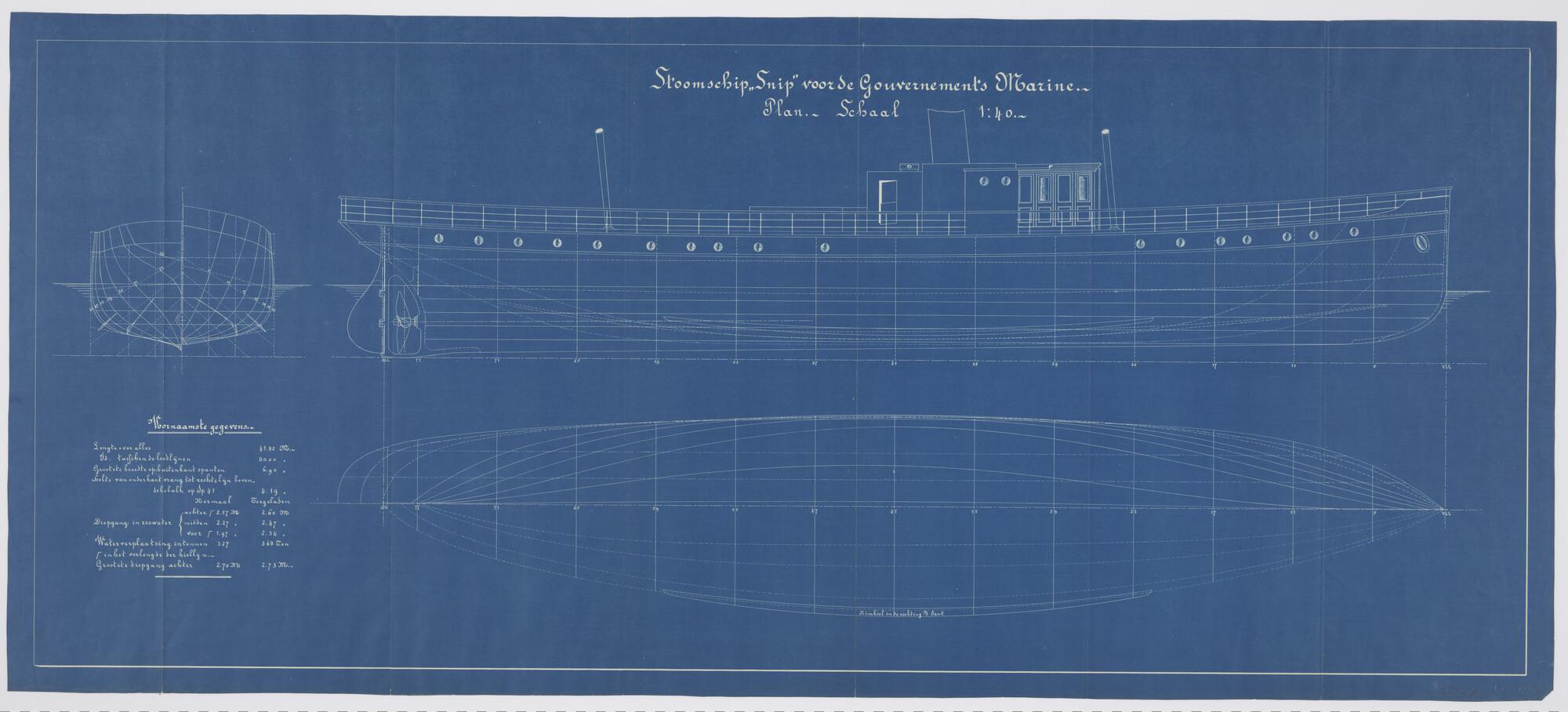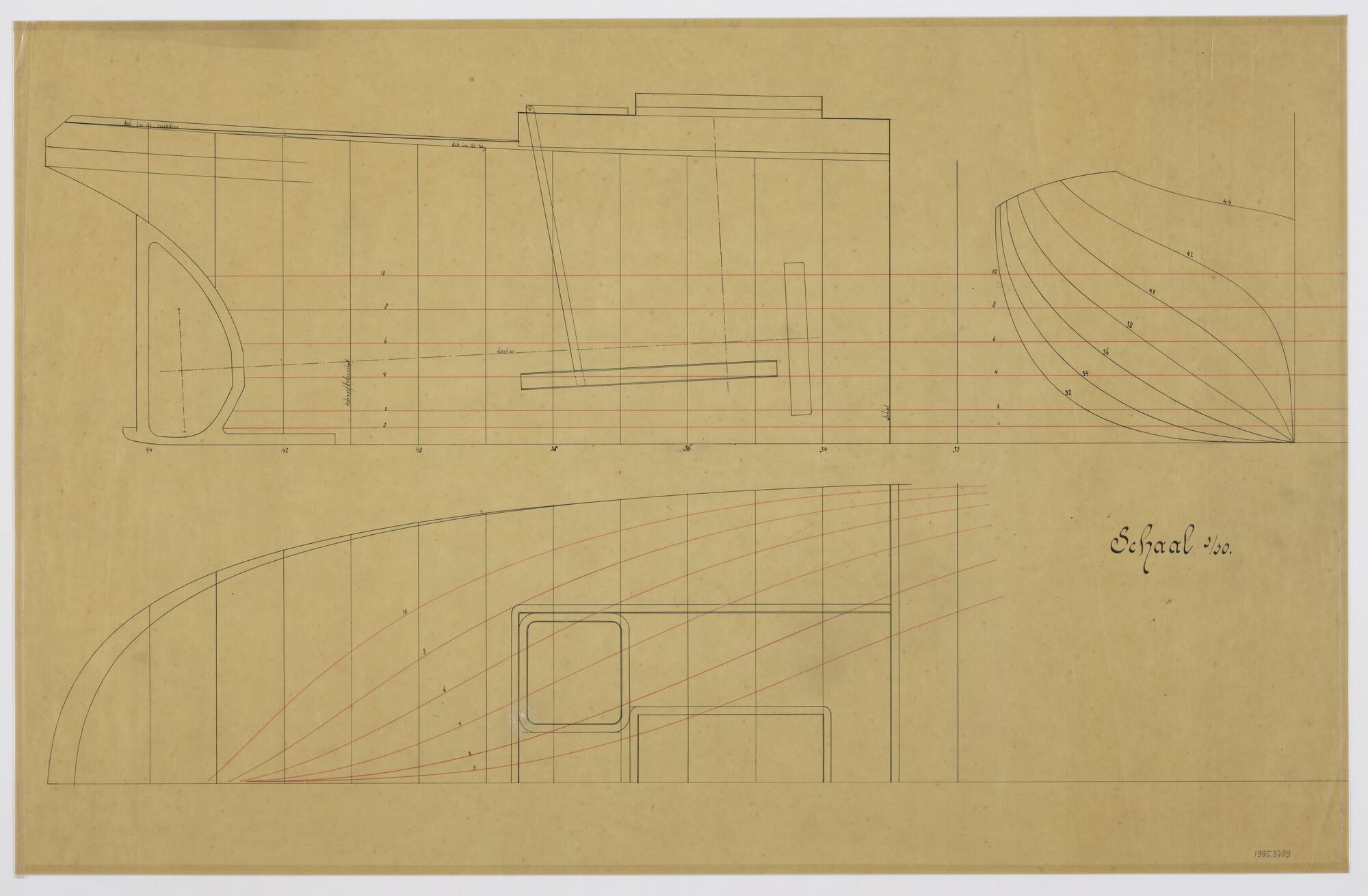 Lijnentekening, spantenraam en overzicht van de voor...