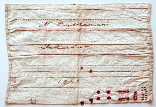 Stoplap, oefenlap van getint katoen. ‘N.R. 1920’