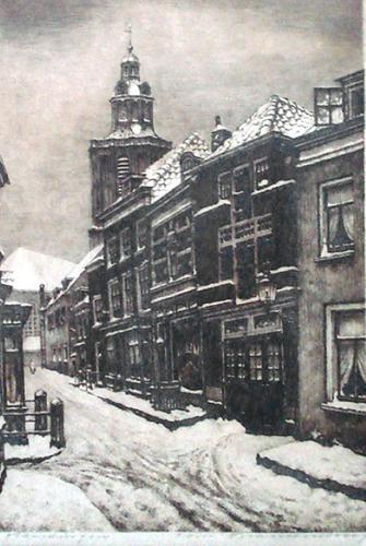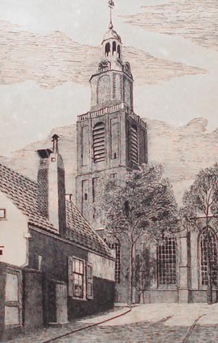 Potloodtekening. Bredesteeg met Grote Kerk Vlaardingen.