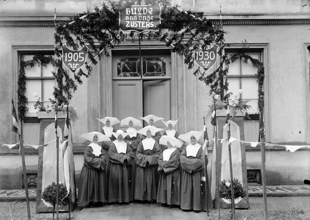 Zusters Vincentius a Paulo onder een ereboog bij 25-...