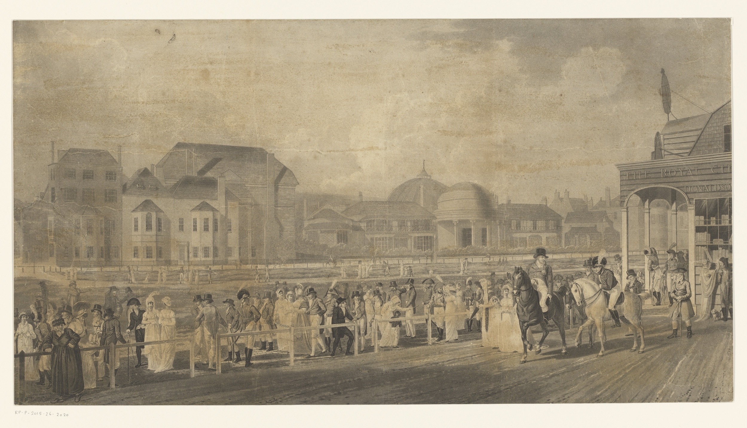 Stadsgezicht met twee mannen te paard