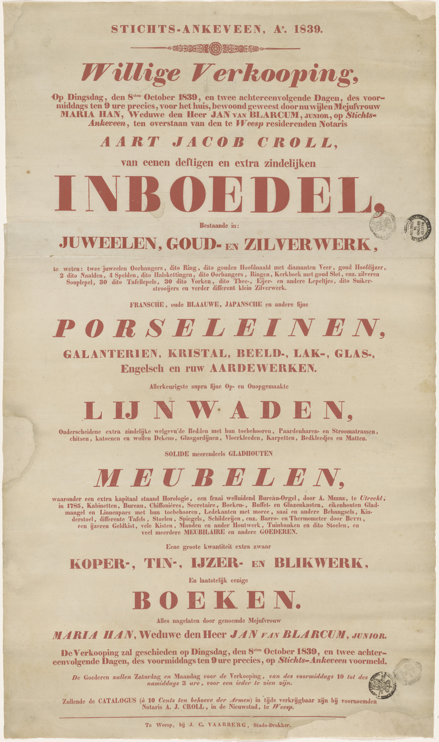 Aankondiging van een inboedelveiling te Ankeveen, 1839