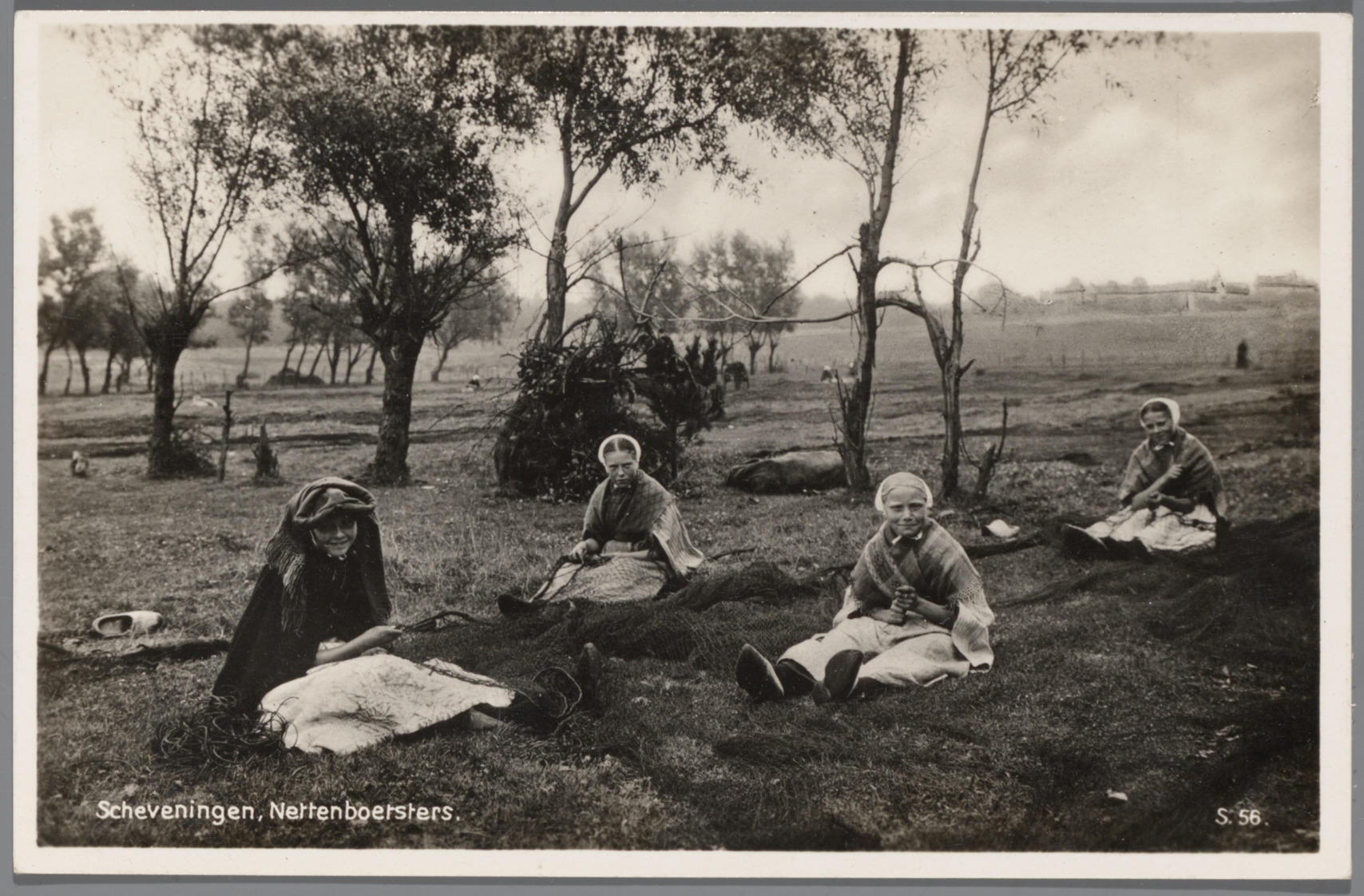 Meisjes in Scheveningse dracht, aan het netten boete...