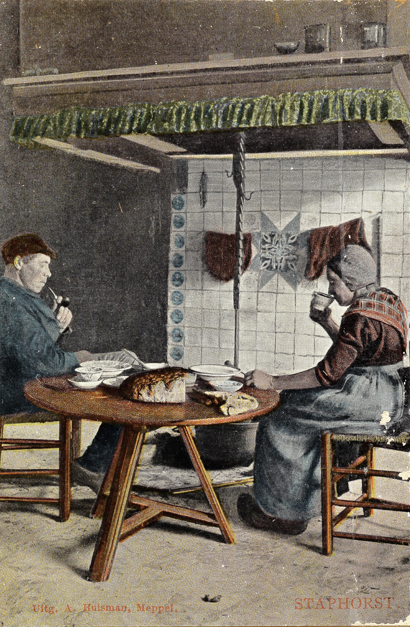 Man en vrouw bij vuurpot, Staphorst (ansichtkaart)