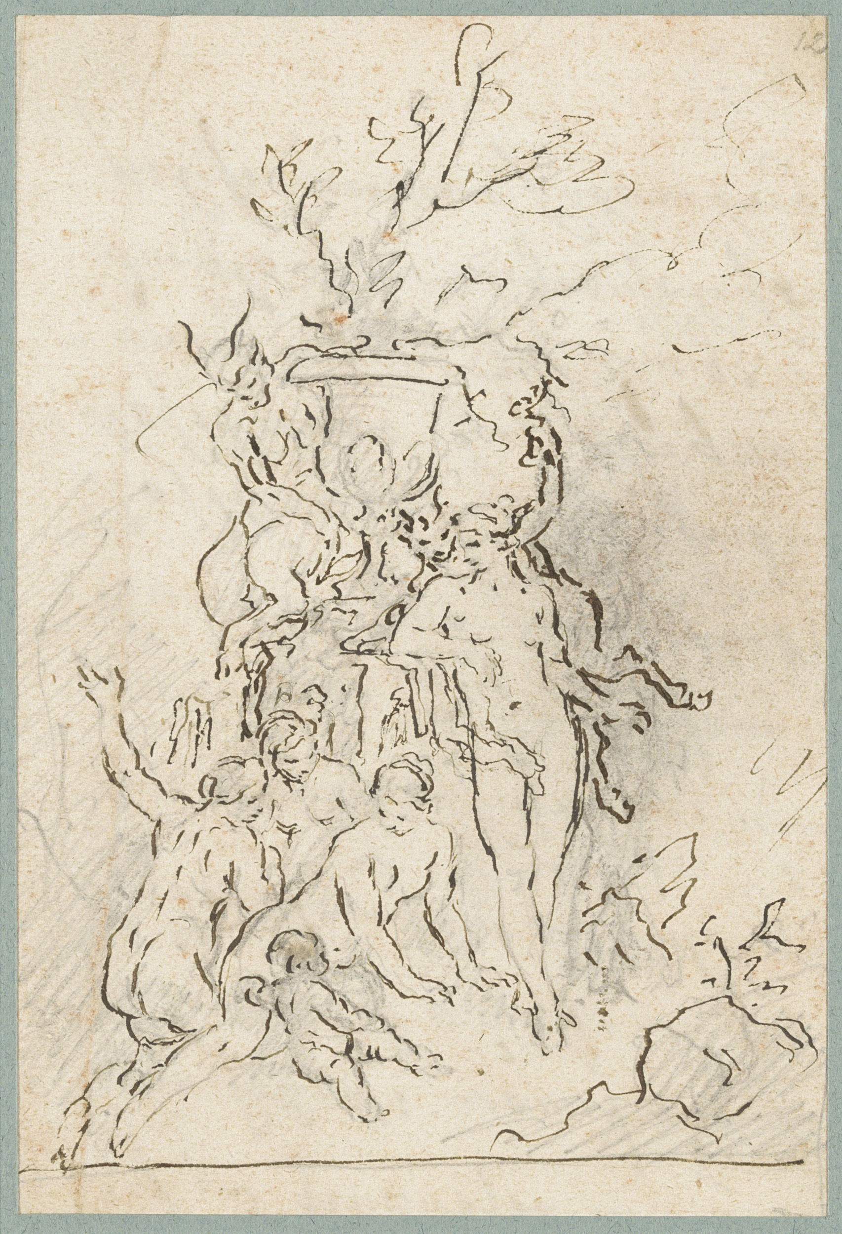 Nimfen en saters opgesteld rondom een siervaas