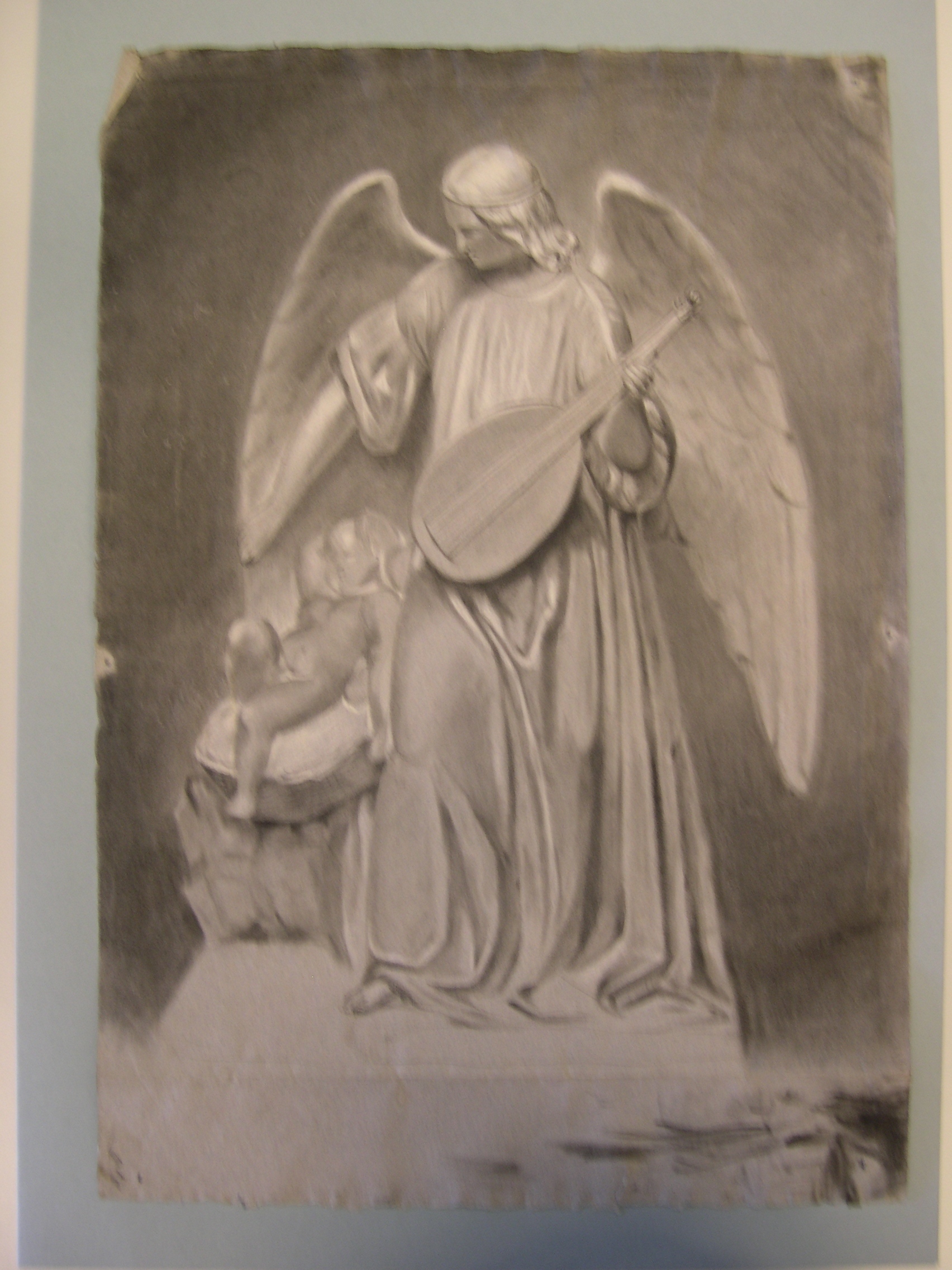 Portrettekening van een engeltje met snaarinstrument