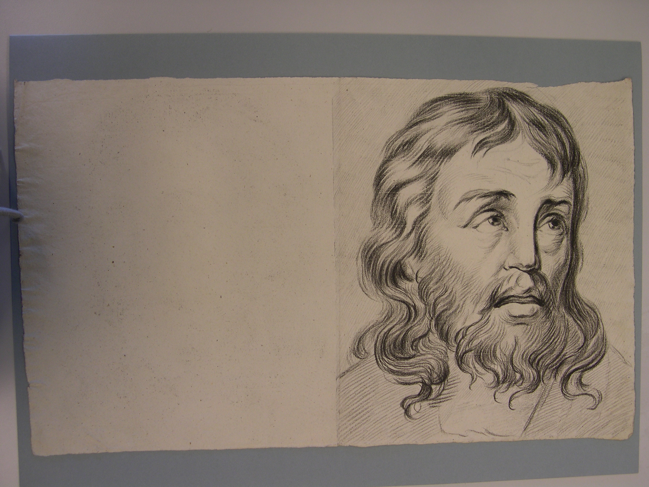 Portrettekening van een man met lang haar en een baard