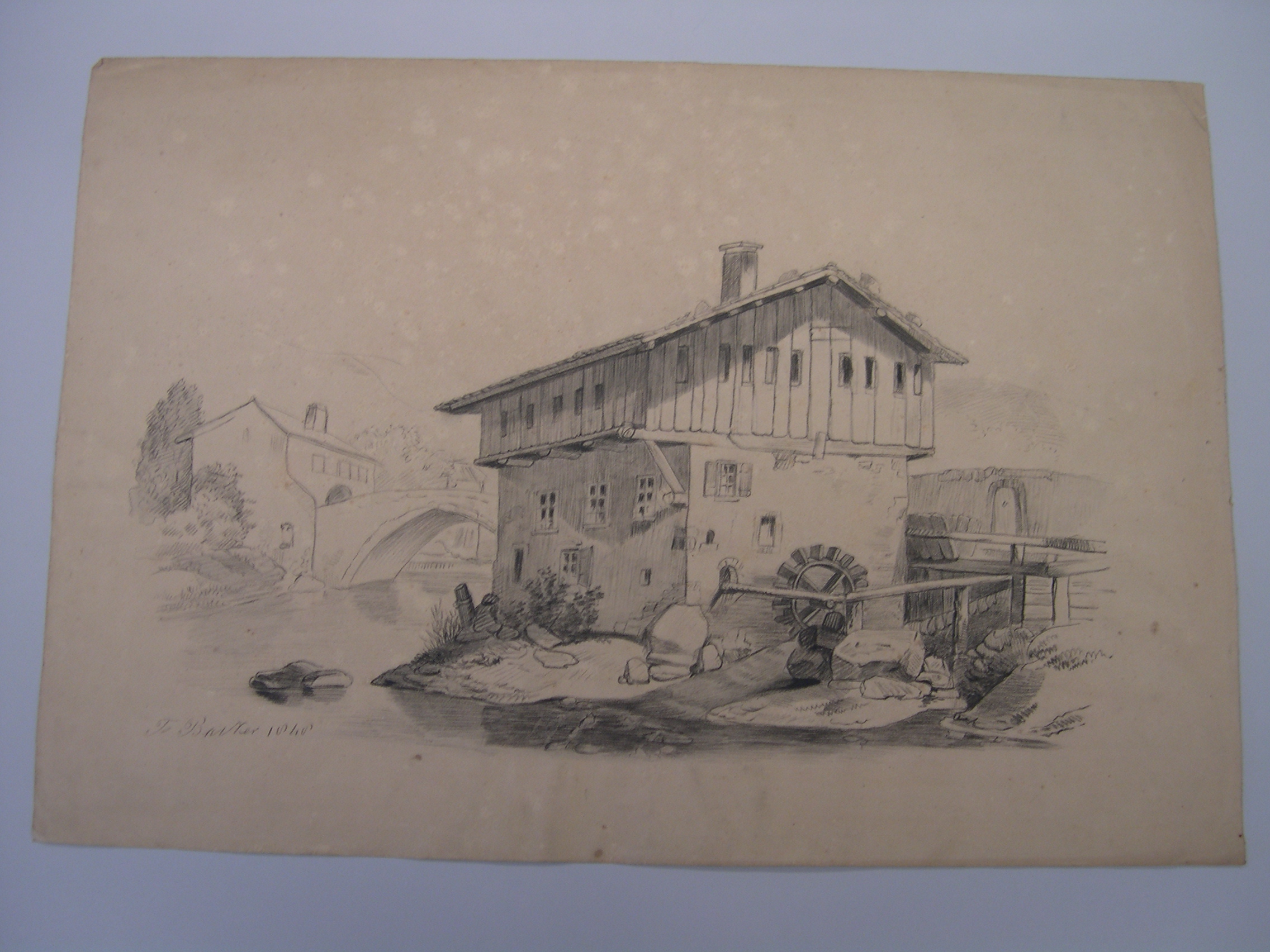Schets van een boerderij lang een beek