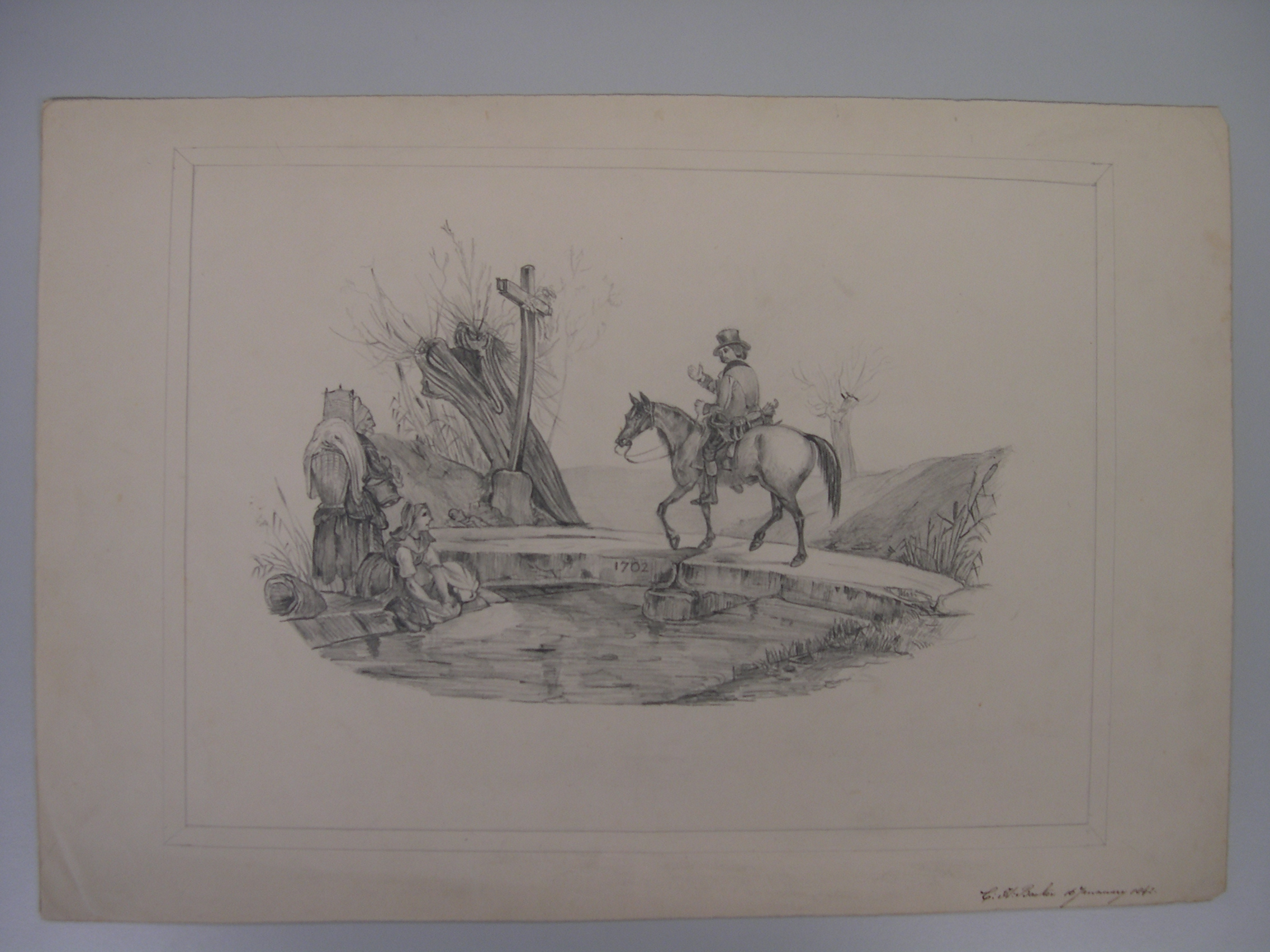 Schets van een landschap met brug en fontein