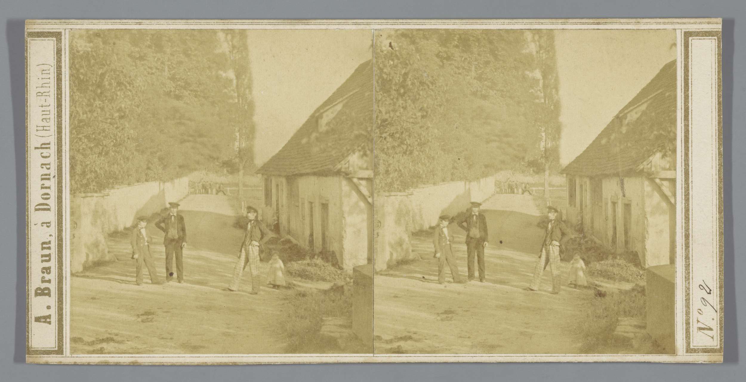 Enkele mannen en kinderen op een dorpsweg, mogelijk ...