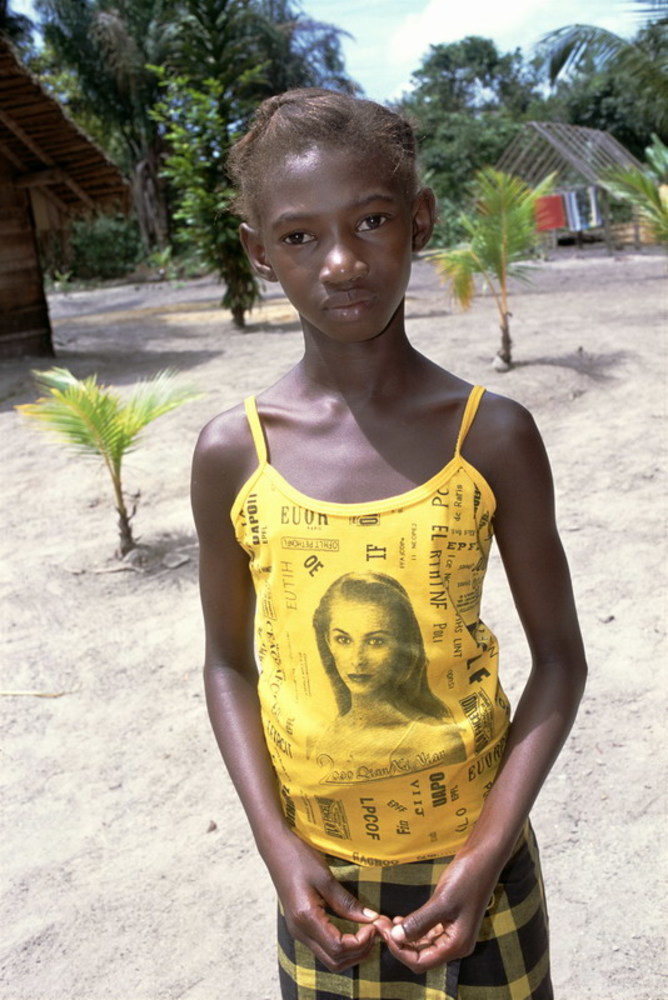 Meisje met geel hemdje met afbeelding van blonde vrouw
