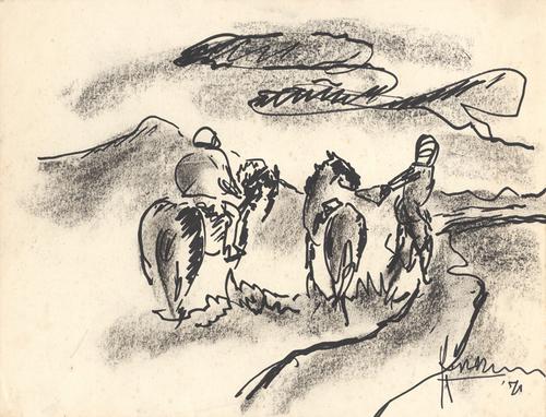 2 Zittende figuren in een landschap